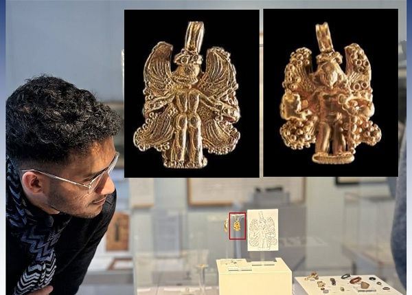 وأوضح أن الباحث اليمني محمد عطبوش، زار المتحف مؤخراً، والتقط صورة توضح حجم التحفة اليمنية الصغير للغاية. موضحاً أن القلادة الذهبية، من القطع الأثرية اليمنية التي لا يعرف لها مثيل.