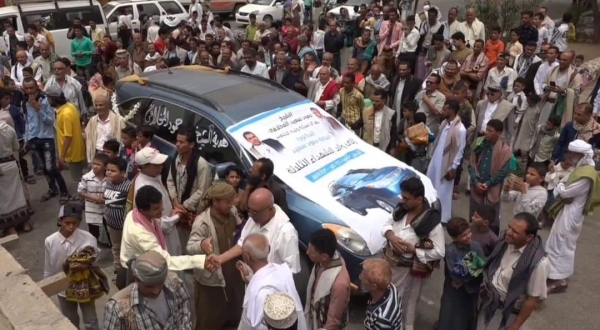 تعز..الشيخ المخلافي يُهدي والد 4 جرحى سيارة نجله الشهيد
