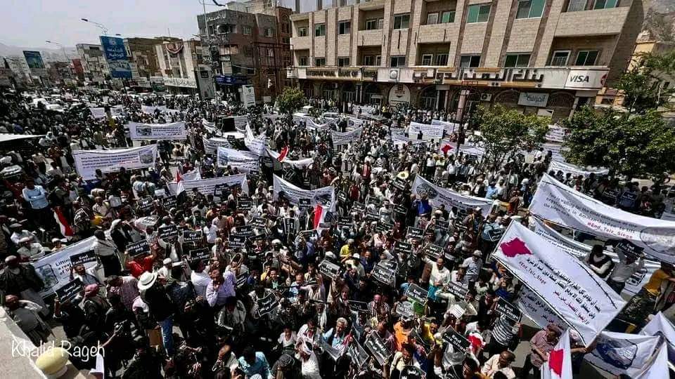 الآلاف في تعز يتظاهرون للتنديد باستمرار الحصار الحوثي على المدينة